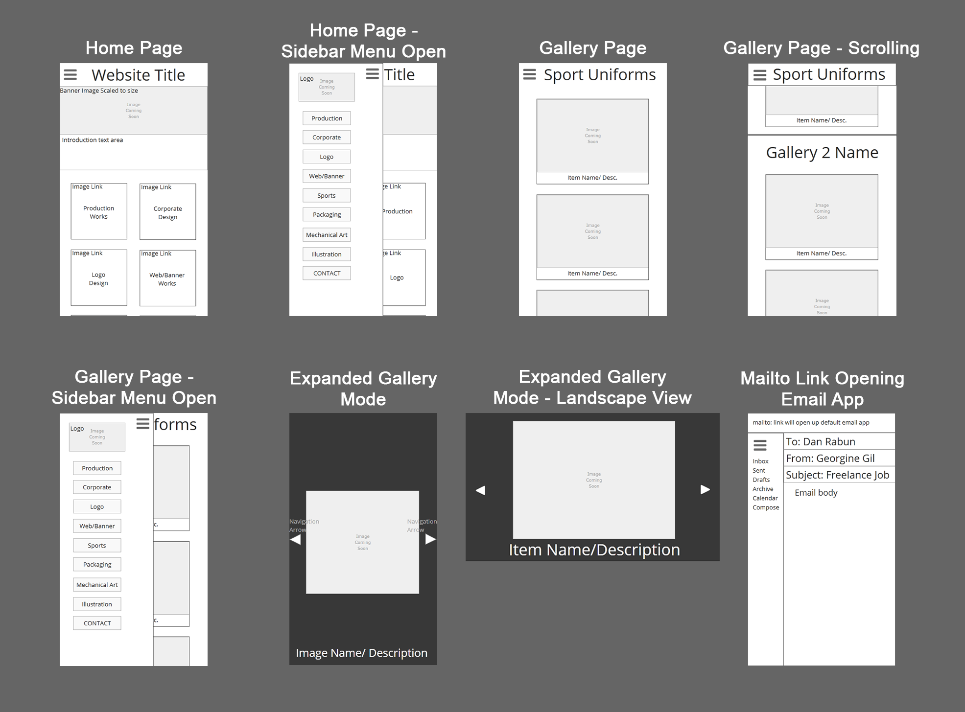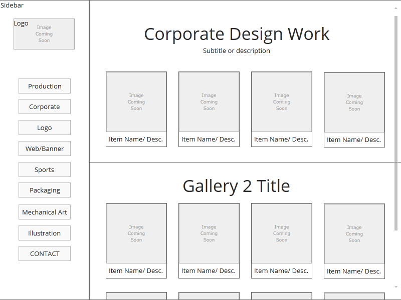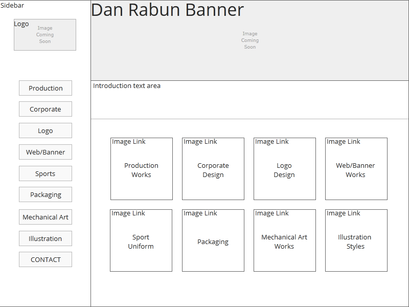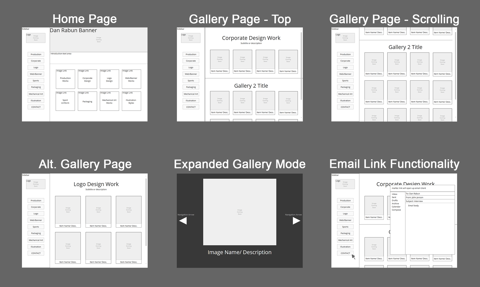 In graphic design, a portfolio essentially acts as a resume, and from my first-hand experience with the hiring process, it’s treated like one. This means most corporate employers have a gratuitous amount of portfolios to look through, and actually spend very little time on the site. They typically spend 1-2 minutes quickly scanning through work samples to determine if the candidate is qualified or not. This meant that the design of the site had to be simple, and facilitate the quick navigation that potential employers will be making use of. This idea would inform my approach to the site design when I built the site map and wireframe. Any page could be reached from any other page, and Dan’s sheer breadth of work would be broken down by a hierarchy of pages and galleries.
