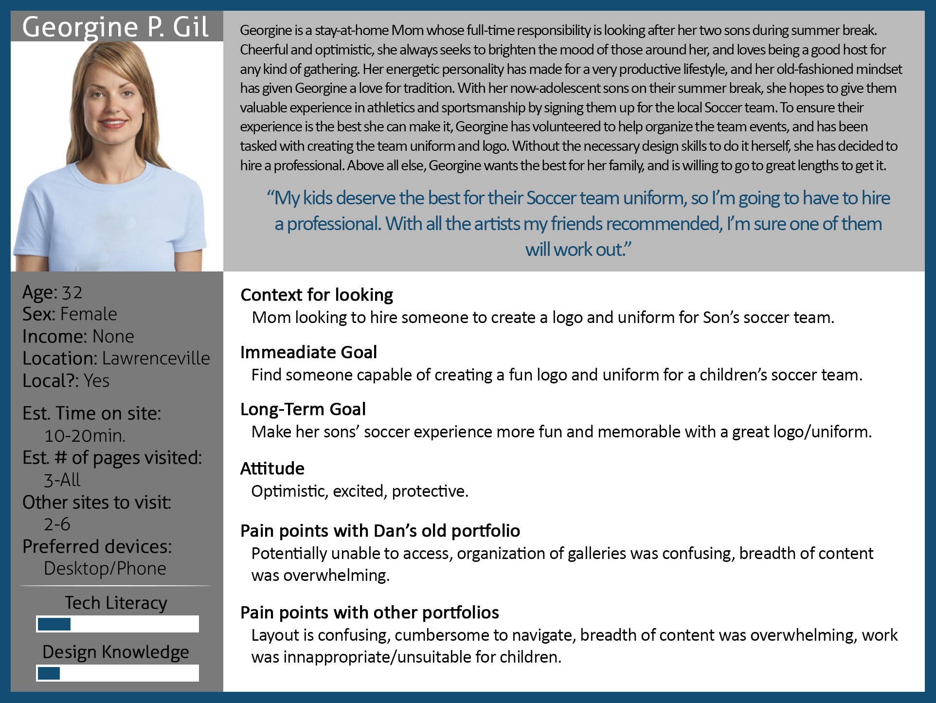With this in mind, I was able to get to work drafting personas to represent these scenarios. I found it best to use my own choice of metrics for the personas. There isn’t much in the way of persona templates or software to work from, and what is out there is very limiting. I prefer to tailor my work to the project at hand, and avoid one-size-fits-all models wherever possible. I came up with three personas: John, Paul, and Georgine. They measure a variety of different criteria, which can be seen below.